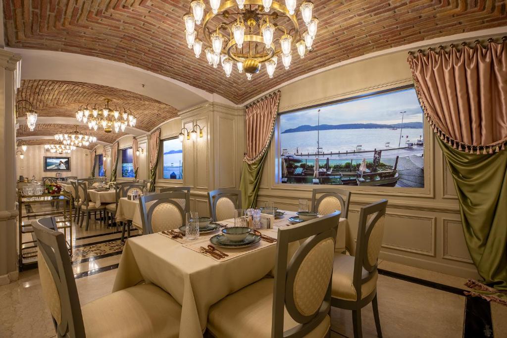 يضم الفندق مطعمًا يقدم أشهى الأطباق التركية والعالمية، بالإضافة إلى مقهي يقدم مجموعة متنوعة من المشروبات. يمكن للنزلاء الاستمتاع بمرافق ترفيهية مثل حوض السباحة ومركز اللياقة البدنية.